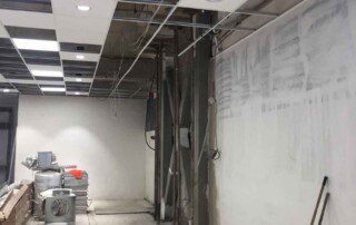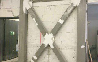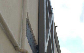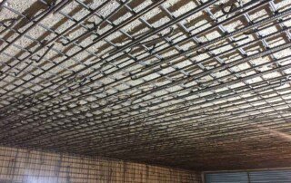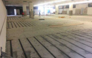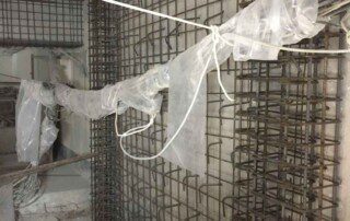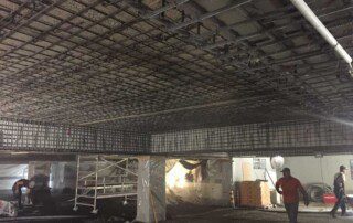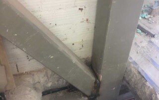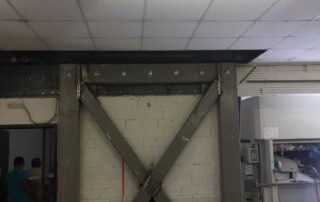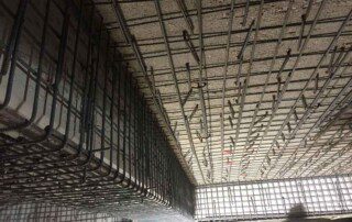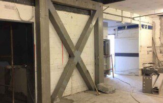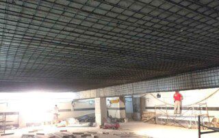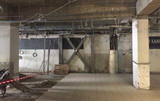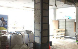 Το έργο περιλαμβάνει την ενίσχυση διώροφου κτιρίου με υπόγειο από οπλισμένο σκυρόδεμα στην Αθήνα. Οι εργασίες ενίσχυσης του φορέα περιελάμβαναν την προσθήκη εξωτερικά και εσωτερικά μεταλλικών χιαστί συνδέσμων και τοιχίων από οπλισμένο σκυρόδεμα, ενώ συγκεκριμένα υφιστάμενα μέλη ενισχύθηκαν με ινοπλισμένα πολυμερή και μεταλλικά ελάσματα. Ένα σημαντικό τμήμα του έργου αφορούσε στην ενίσχυση της πλάκας οροφής του υπογείου επιφανείας 1000m², η οποία είχε υποστεί σημαντικές βλάβες και καθιζήσεις έως 6cm(!) λόγω αυξημένων κατακορύφων φορτίων και λαθών στο σχεδιασμό της. Η ενίσχυση της πλάκας πραγματοποιήθηκε με συνδυασμό εκτοξευόμενου σκυροδέματος (στην κάτω παρειά) και ανθρακοελασμάτων (στην άνω παρειά).