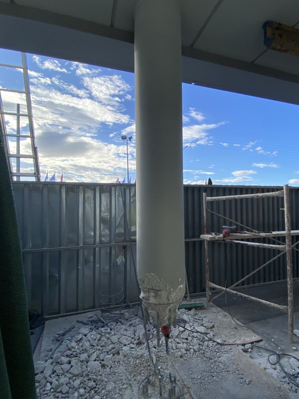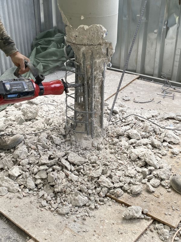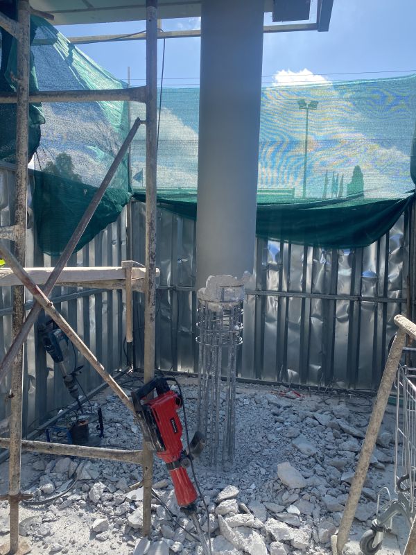 Η καθαίρεση πραγματοποιήθηκε με εφαρμογή προσωρινής αντιστήριξης των υπερκείμενων πλακών, προκειμένου να διασφαλιστεί η στατική επάρκεια του φορέα κατά τη διάρκεια των εργασιών. Μετά την απομάκρυνση των υποστυλωμάτων, ακολούθησε η οριστική υποστήριξη των υπερκείμενων πλακών και δοκών μέσω της κατασκευής μεταλλικού πλαισίου.